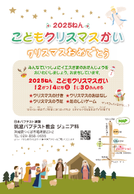ようこそ筑波バプテスト教会へ。私たちはあなたと共に聖書を読み、主イエス・キリストを礼拝できることを心から願っています。互いに祈りあい、支えあい、愛しあうことは、聖書が教える最も大切なことです。教会は初めてという方でも大歓迎です。いつでもお待ちしております。 集会案内 どの集会にもお気軽にご出席ください 教会紹介 筑波バプテスト教会について 牧師紹介 当教会の牧師について 教会学校 子供から大人までの教会学校 交通アクセス 教会へはこの地図を見ておいでください リンク 教会の関係各方面へのリンクです -------------------------------------------------------------- <こどもクリスマス会> 12月14日(日)13時30分〜15時