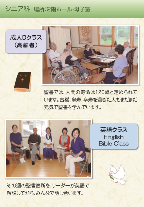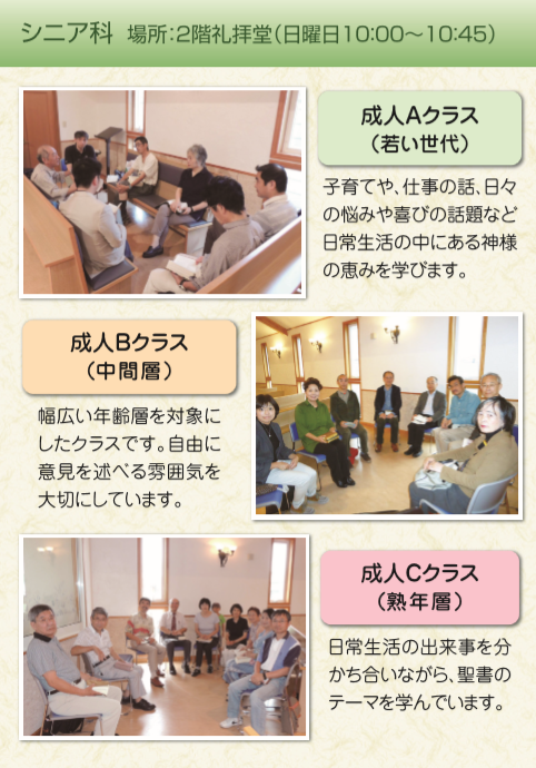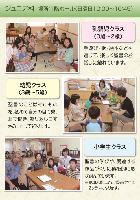 大人から子供までの教会学校 ・・・・・・・・・・・・・・・・・・・・・・・・・・・・・・・・ 大人から子供まで全年齢層を対象とした教会学校です。シニアから、生まれた後すぐの嬰児まで、様々なクラスで聖書を学びあう時間を持っています。共に集い交わる中で、自身の悩みや苦しみ、また喜びや幸せを共に分かち合いながら、すばらしい日曜日の午前の時を過ごします。どなたでも参加できます。ぜひ、教会学校へお越しください。 心よりお待ちしております。