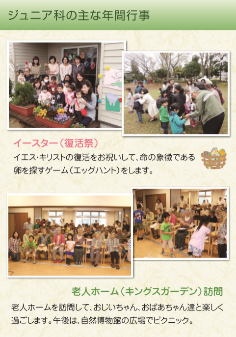 ジュニア科 乳嬰児クラス・幼児クラス・小学生クラス シニア科 少年少女クラス・青年クラス 成人Aクラス(若い世代)・成人Bクラス(中間層) 成人Cクラス(熟年層) 成人Dクラス(高齢者)・英語クラス 年間行事 ジュニア科の主な年間行事